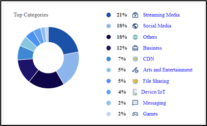 The Top Categories pie chart groups the applications used by the users into categories and shows the percentage of data used by each category. These categories cover different genres such as Streaming Media, Social Media, Business, Arts & Entertainment Games etc. Hovering on any item on the pie chart highlights the category and shows the amount data consumed by that category in GB.