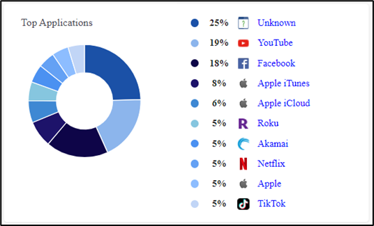 The Top Applications pie chart shows the percentage of data consumed by the different applications. Hovering on any item on the pie chart highlights the application and shows the amount data consumed by that application in GB.