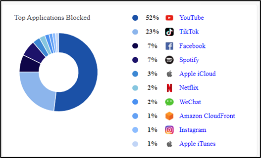The Top Applications Blocked pie chart shows the percentage of hits garnered by the different blocked applications. Hovering on any item on the pie chart highlights the application and shows the number of hits gained by that application.