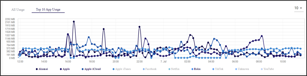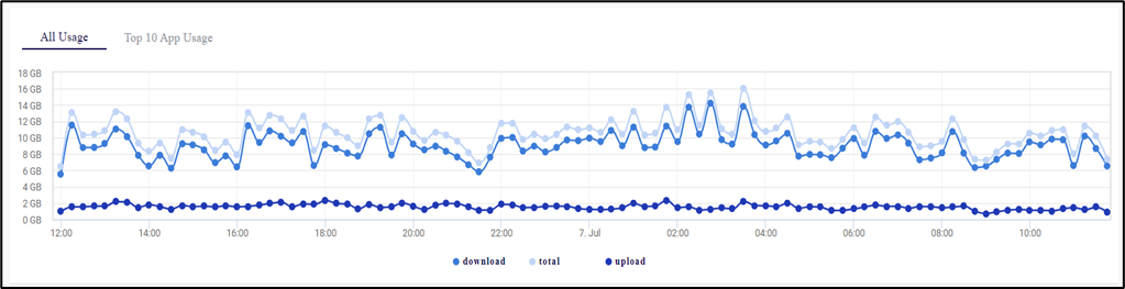 Top 10 App Usage section shows a line chart that displays the amount of data used by the top applications at different time instances. The horizontal axis contains the time instances, and the vertical axis contains the amount of data in GB. The graph between these two axes gives the user a clear understanding of how the data has been consumed over the given time period.