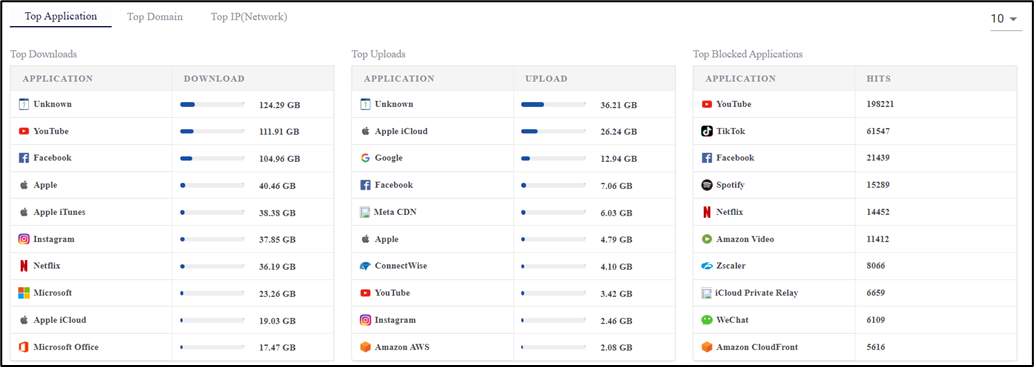 The Top Application section shows three tables namely, Top Downloads, Top Uploads and Top Blocked Applications.