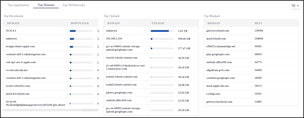 The Top Domain section shows three tables namely, Top Downloads, Top Uploads and Top Blocked.
