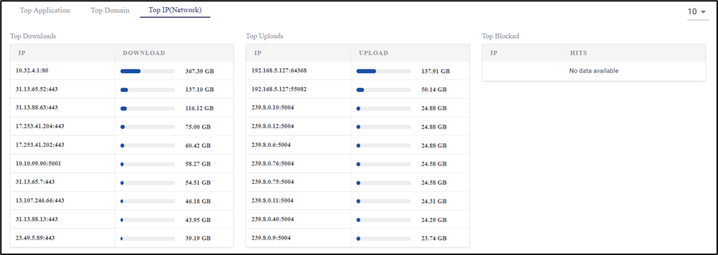 The Top IP(Network) section shows three tables namely, Top Downloads, Top Uploads and Top Blocked.
