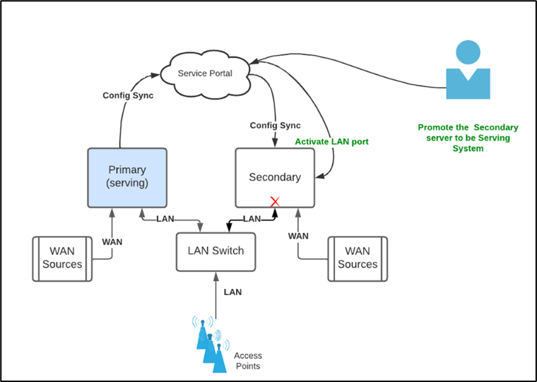 For the HA feature to work successfully, both Primary and Secondary servers have to be connected to the Internet. The configuration between the servers is periodically synced and LAN ports are active/enabled only on the Serving System. When the primary server/serving system fails, user can promote the secondary server to be the serving system by logging into Nexus Cloud.