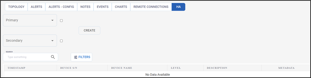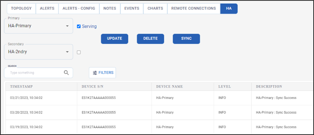 The HA Log table shows the event history of all the actions and configurations done in the HA screen. It shows the Timestamp, Device Serial Number, Device Name, Description and Metadata.