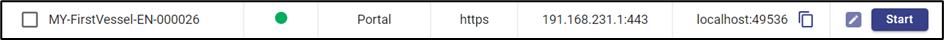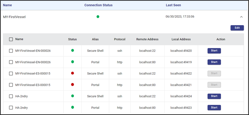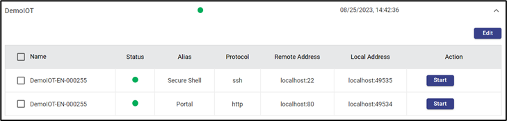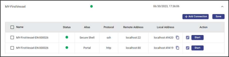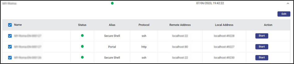Start button under the Action column enables the user to start the connection of that device. On clicking it the connection will be established given that the Device is online.