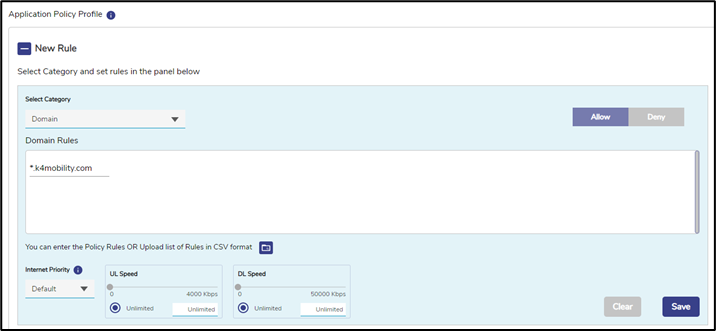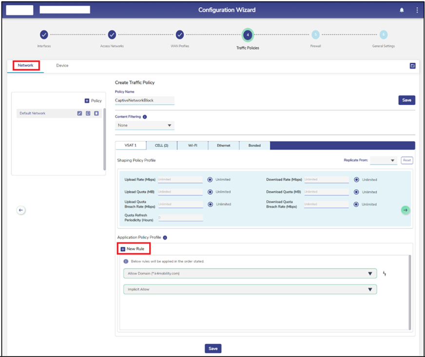 Create one or more Device Traffic Policies similarly in the Device Policy Section which will apply to the devices connecting via Captive Access Network. These policies will be associated with the plans assigned to users of these devices. The admin can add rules depending on what the captive devices must access and must not access. The Device Traffic Policy name must match the Traffic Policy configured in the Captive Portal Administrative portal.