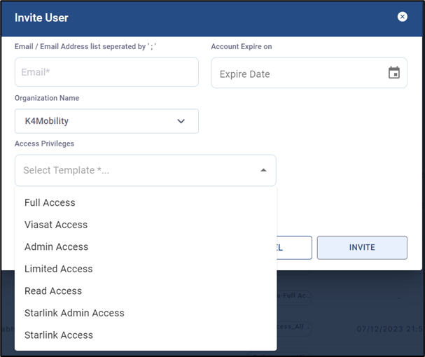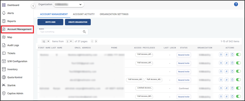 Note: The users that are given access only for Starlink operations cannot access the other options in Nexus Cloud such as Dashboard, Alerts, Reports, Account Management, Map, Audit Logs, Tickets, S/W Configuration, Inventory, Quota Kontrol and Captive Admin. The user account needs Full Access Privilege to access these features.