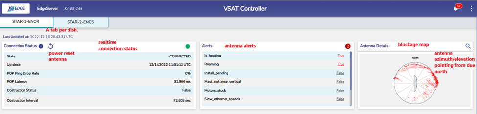 With this, the full management page is available on the VSAT Controller Page; from the Edge User Interface → Menu (upper right) → VSAT Controller. The VSAT Controller Page will load, and a “Starlink Tab” will be available for every configured Starlink – one can add 3 Starlink’s for example. Details of the management page are presented in the documents below.