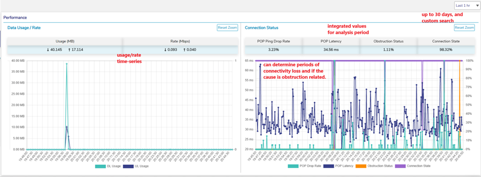 Each Starlink has a management tab that provides real-time status, and historical time-series context to understand outages/performance. Additionally, an obstruction map is provided giving obstruction context with the Starlink antenna.